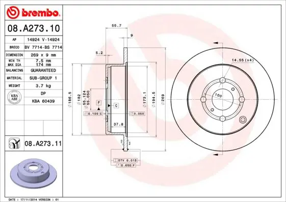 BREMBO 08.A273.11 Fren Dıskı Arka Uv Coated Toyota 424310D050, 191191SPORT, BR9408C, 986479B71, 8612660080, 5311128550, 54262, 17457, PRF066, 5311028550