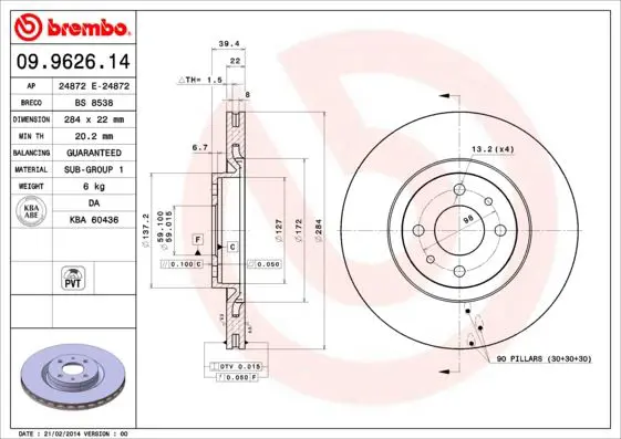 BREMBO 09.9626.14 Fren Dıskı On Standard Alfa Romeo 9505810, 63151, 60811890, BG617, 561508BC, 561508JC, DDF252, 60811878, L2081V, RCDI01800