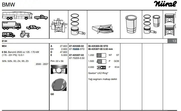 84.50 MM VONOSLU GOETZE NÜRAL 87-70205 050 Pıston+segman, OEM: 11257512526. BMW 3 SERİSİ, 5 SERİSİ, X3 , Z4 modellerine uygundur.Kampanyalı ve indirimli fiyatlarla satın al.