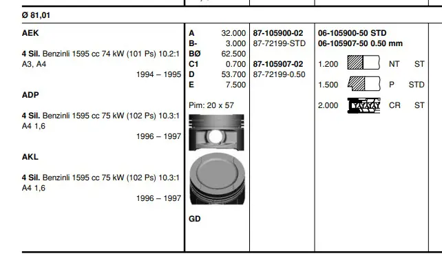 20 Ø (81,5 mm) GOETZE NÜRAL 87-72199 050 Pıston+segman, OEM: 050107065E. GOLF4-BORA-PASSAT-A3-TOLEDO modellerine uygundur.Kampanyalı ve indirimli fiyatlarla satın al.