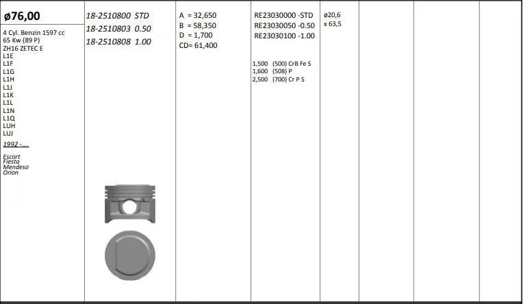- Motor Piston+segmani ( Riken ) 76 00+0 50mm Cap Escort Fiesta Mendeso Orion Zh16 Zetec E-L1e-L1f-L1g-L1h-L1j-L1k-L1l-L1n-L1q-L 4 Sil. Benzinli 1597 Cc-65 Kw (89 P)