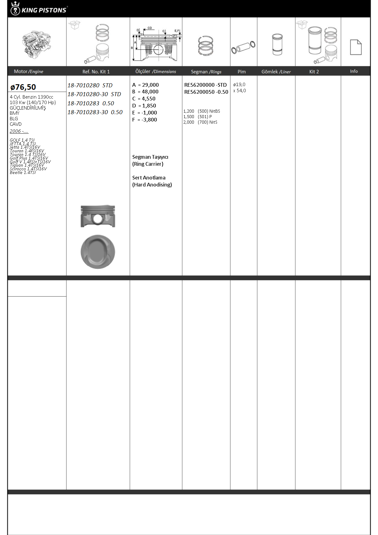 KING PISTON 18-7010283 Pıston+segman (77,01mm 0,50) Golf V - Vı - Plus Alhamra Beetle (Touran 1,4tsı - Fsı) Eos Jetta Iıı - 03C107065AQ, 03C107065AS, 03C107065BF, 03C107065AQ, 87-72513