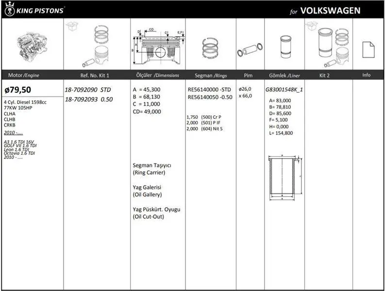 KING PISTON 18-7092093 Piston + Segman 0.50 80.00mm Golf Vii Passat Touran A1 A3 Leon Toledo Octavia Rapid Superb 1.6tdi Dcxa Dcza Clha Clhb Crka Crkb Cxxa Cxxb 04L107065D