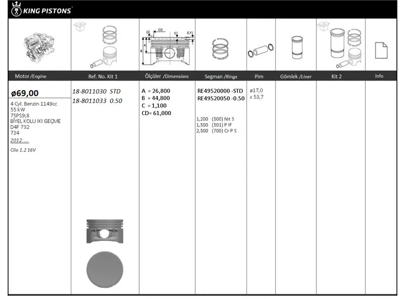 KING PISTON 18-8011030 Motor Pıston Segman Clıo 1,2 16v D4f (69,00mm) - Std, OEM: 7701475781, 40219600, 219700, 8745000000, 69075, 69L23, 8771985, 8787010022, 7138565000, 7138560000. Düşük kargo bedeli. Kampanyalı ve indirimli fiyatlarla satın al.