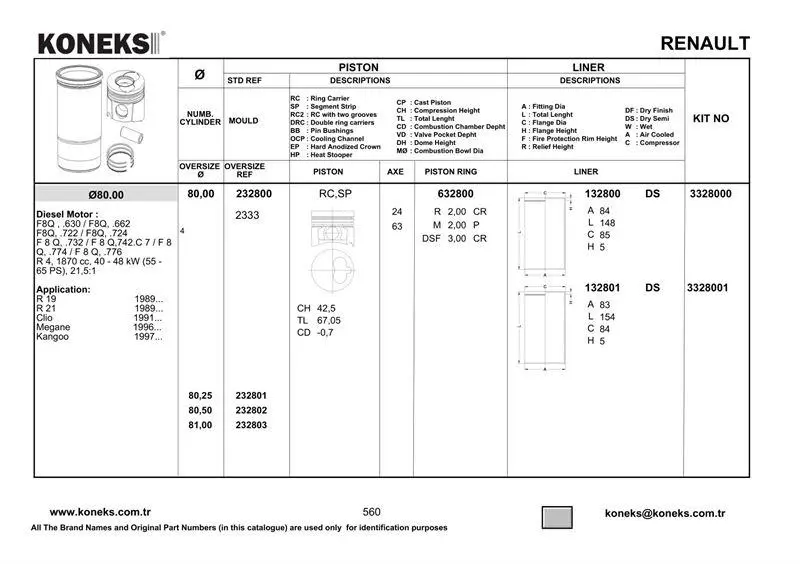 | RENAULT 19 II 1.9 D F8Q706 | 03.1992-12.1995 | 65 | Kasa/eğik arka |