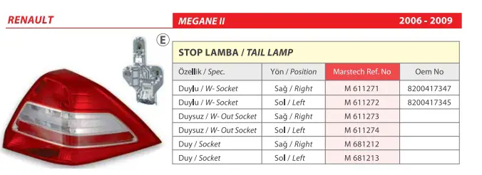 MARS M611274 Stop Sol 611274 Megane 06-10 Duysuz, OEM: 8200417345, 50765637, 4375933. RENAULT MEGANE II modellerine uygundur.Kampanyalı ve indirimli fiyatlarla satın al.