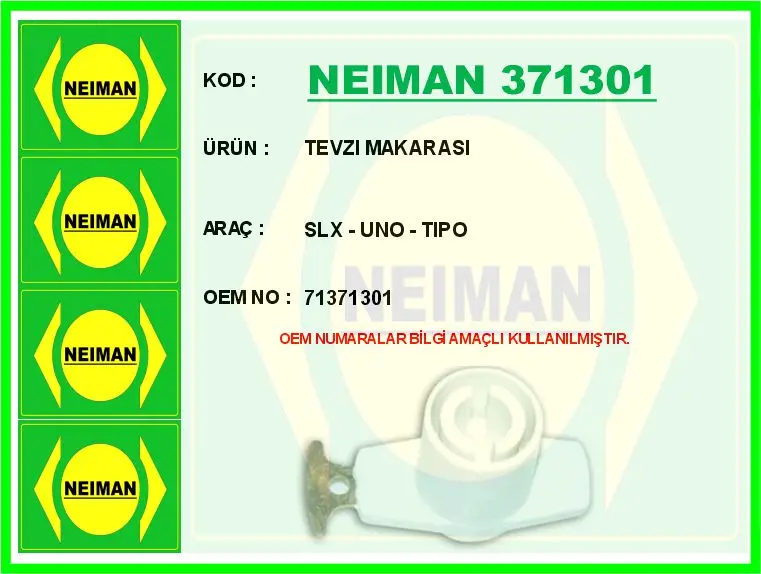 NEIMAN 371301 Dıstrıbutor Tevzı Makarası Slx , OEM: NVL130, 38260, 2590916, 9946356, 71371301, 343933, 47940, V24700020, 9944407, M886. CİTROEN AX - FIAT COUPE , FIORINO , PANDA , TEMPRA , TIPO , UNO - LANCIA DEDRA , DELTA I, Y10 - PEUGEOT 106 I, 205 II modellerine uygundur.Kampanyalı ve indirimli fiyatlarla satın al.