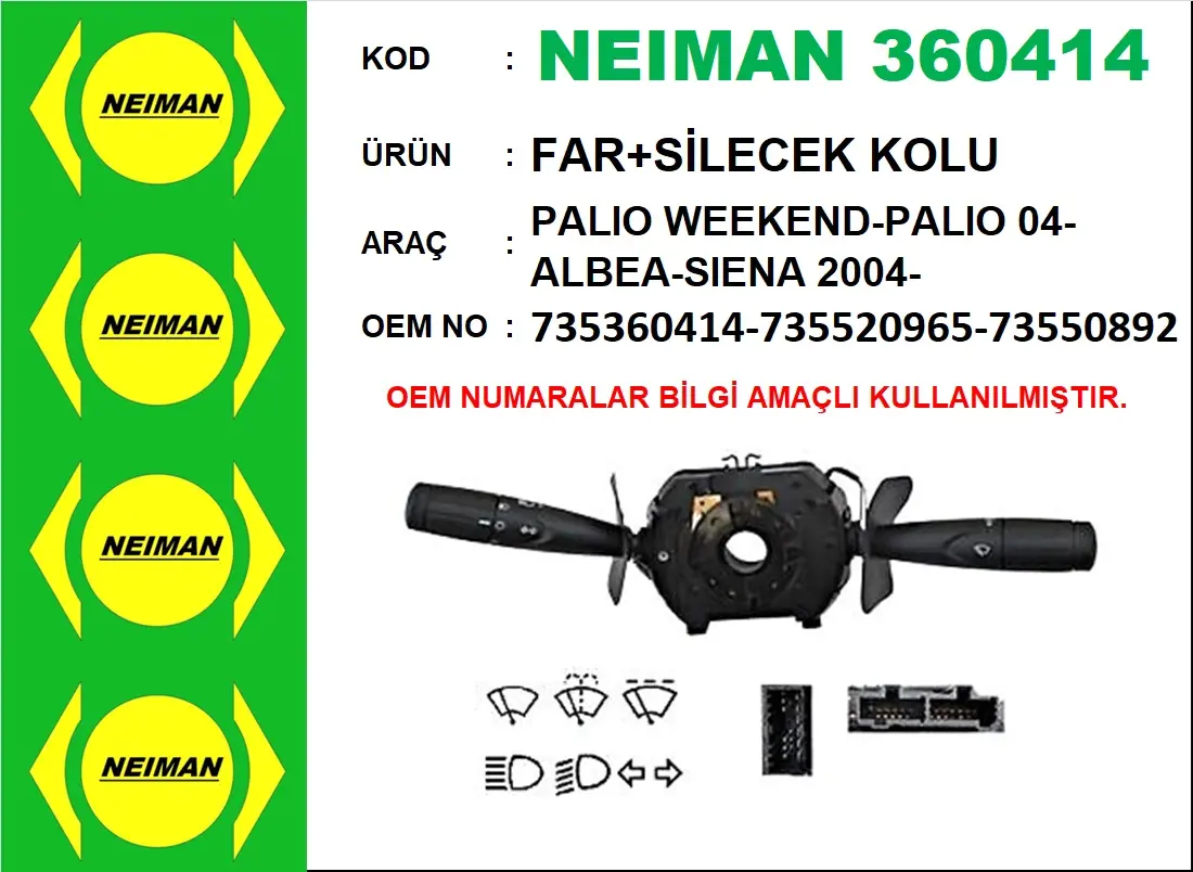 NEIMAN 360414 Far+Silecek Kolu F.Palıo Weekend-Palıo 04-Albea-Sıena 2004- 735360414, 461800665, 430668, 735508924, 231035, 21031035, WG1963555, 60082303OEM, 38SKV527, 60082303