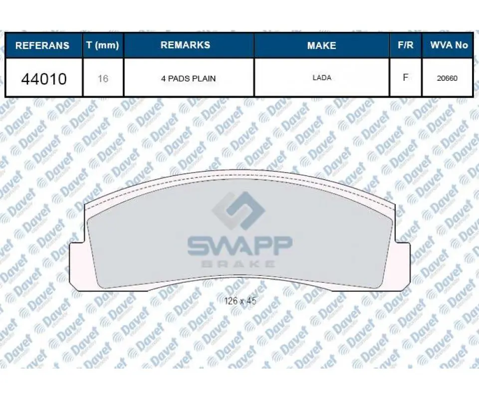 SWAPP 44010 Fren Balatası On Nıva 1.7 Wva 20660 1061F, 1637400157, 1637400557, 21013501089, 21013501090, 2101350109001, 210135011090, 21013501190, 21013501210A, 21080350107000