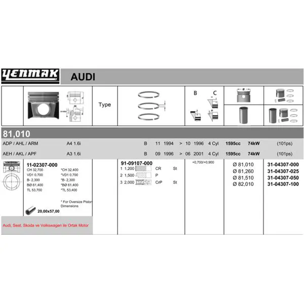 YENMAK 4307-100 Pıston+segman Audı Volkswagen Øa3,A4 - Passat,Golf Iv, Golf Iıı,Polo,Vento,Leon,Bora Adp - Aeh - A, . VOLKSWAGEN GRUP modellerine uygundur. Düşük kargo bedeli. Kampanyalı ve indirimli fiyatlarla satın al.